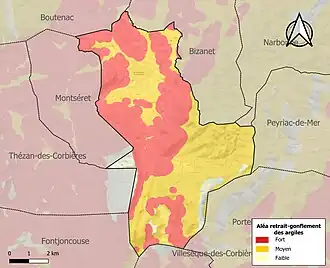 Le retrait-gonflement des sols argileux est susceptible d'engendrer des dommages importants aux bâtiments en cas d’alternance de périodes de sécheresse et de pluie. 95,6 % de la superficie communale est en aléa moyen ou fort (75,2 % au niveau départemental et 48,5 % au niveau national). Sur les 760 bâtiments dénombrés sur la commune en 2019, 760 sont en aléa moyen ou fort, soit 100 %, à comparer aux 94 % au niveau départemental et 54 % au niveau national. Une cartographie de l'exposition du territoire national au retrait gonflement des sols argileux est disponible sur le site du BRGM[31],[Carte 3].