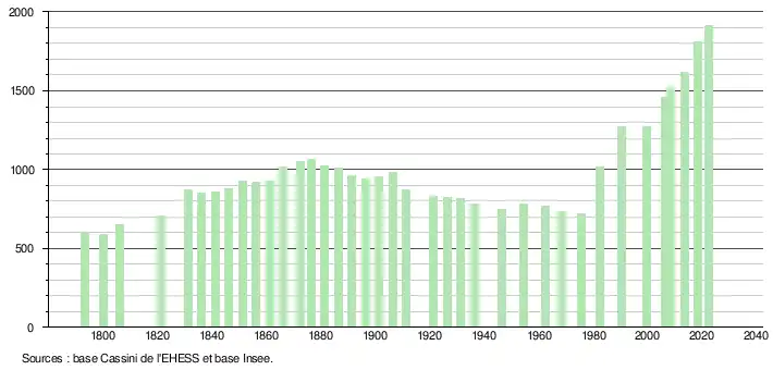 | L'évolution du nombre d'habitants est connue à travers les recensements de la population effectués dans la commune depuis 1793. Pour les communes de moins de 10 000 habitants, une enquête de recensement portant sur toute la population est réalisée tous les cinq ans, les populations de référence des années intermédiaires étant quant à elles estimées par interpolation ou extrapolation[29]. Pour la commune, le premier recensement exhaustif entrant dans le cadre du nouveau dispositif a été réalisé en 2008[30]. En 2022, la commune comptait 1 913 habitants[Note 5], en évolution de +11,22 % par rapport à 2016 (Landes : +5,78 %, France hors Mayotte : +2,11 %). |