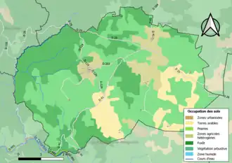 L'occupation des sols de la commune, telle qu'elle ressort de la base de données européenne d’occupation biophysique des sols Corine Land Cover (CLC), est marquée par l'importance des forêts et milieux semi-naturels (79,8 % en 2018), une proportion sensiblement équivalente à celle de 1990 (80,5 %). La répartition détaillée en 2018 est la suivante : milieux à végétation arbustive et/ou herbacée (46,3 %), forêts (33,5 %), terres arables (11,3 %), zones agricoles hétérogènes (8,9 %)[30].