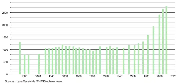 L'évolution du nombre d'habitants est connue à travers les recensements de la population effectués dans la commune depuis 1793. À partir du , les populations légales des communes sont publiées annuellement dans le cadre d'un recensement qui repose désormais sur une collecte d'information annuelle, concernant successivement tous les territoires communaux au cours d'une période de cinq ans. Pour les communes de moins de 10 000 habitants, une enquête de recensement portant sur toute la population est réalisée tous les cinq ans, les populations légales des années intermédiaires étant quant à elles estimées par interpolation ou extrapolation[17]. Pour la commune, le premier recensement exhaustif entrant dans le cadre du nouveau dispositif a été réalisé en 2004[18],[Note 1].