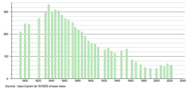 L'évolution du nombre d'habitants est connue à travers les recensements de la population effectués dans la commune depuis 1793. Pour les communes de moins de 10 000 habitants, une enquête de recensement portant sur toute la population est réalisée tous les cinq ans, les populations de référence des années intermédiaires étant quant à elles estimées par interpolation ou extrapolation[17]. Pour la commune, le premier recensement exhaustif entrant dans le cadre du nouveau dispositif a été réalisé en 2006[18].