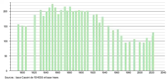 L'évolution du nombre d'habitants est connue à travers les recensements de la population effectués dans la commune depuis 1793. Pour les communes de moins de 10 000 habitants, une enquête de recensement portant sur toute la population est réalisée tous les cinq ans, les populations de référence des années intermédiaires étant quant à elles estimées par interpolation ou extrapolation[15]. Pour la commune, le premier recensement exhaustif entrant dans le cadre du nouveau dispositif a été réalisé en 2006[16].