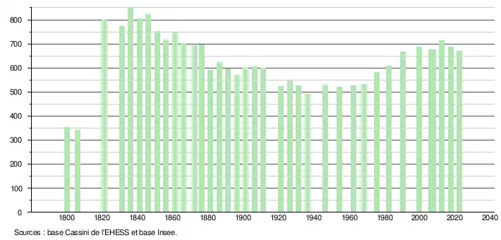 L'évolution du nombre d'habitants est connue à travers les recensements de la population effectués dans la commune depuis 1800. Pour les communes de moins de 10 000 habitants, une enquête de recensement portant sur toute la population est réalisée tous les cinq ans, les populations de référence des années intermédiaires étant quant à elles estimées par interpolation ou extrapolation[32]. Pour la commune, le premier recensement exhaustif entrant dans le cadre du nouveau dispositif a été réalisé en 2007[33].