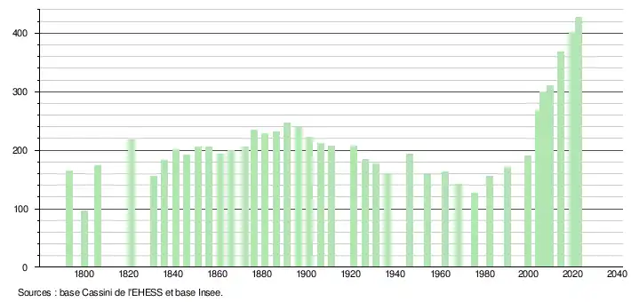 L'évolution du nombre d'habitants est connue à travers les recensements de la population effectués dans la commune depuis 1793. Pour les communes de moins de 10 000 habitants, une enquête de recensement portant sur toute la population est réalisée tous les cinq ans, les populations de référence des années intermédiaires étant quant à elles estimées par interpolation ou extrapolation[15]. Pour la commune, le premier recensement exhaustif entrant dans le cadre du nouveau dispositif a été réalisé en 2004[16].