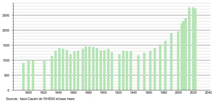L'évolution du nombre d'habitants est connue à travers les recensements de la population effectués dans la commune depuis 1793. Pour les communes de moins de 10 000 habitants, une enquête de recensement portant sur toute la population est réalisée tous les cinq ans, les populations de référence des années intermédiaires étant quant à elles estimées par interpolation ou extrapolation[26]. Pour la commune, le premier recensement exhaustif entrant dans le cadre du nouveau dispositif a été réalisé en 2004[27].
