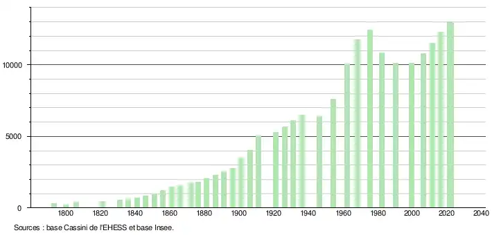 L'évolution du nombre d'habitants est connue à travers les recensements de la population effectués dans la commune depuis 1793. Pour les communes de plus de 10 000 habitants les recensements ont lieu chaque année à la suite d'une enquête par sondage auprès d'un échantillon d'adresses représentant 8 % de leurs logements, contrairement aux autres communes qui ont un recensement réel tous les cinq ans[24],[Note 5].