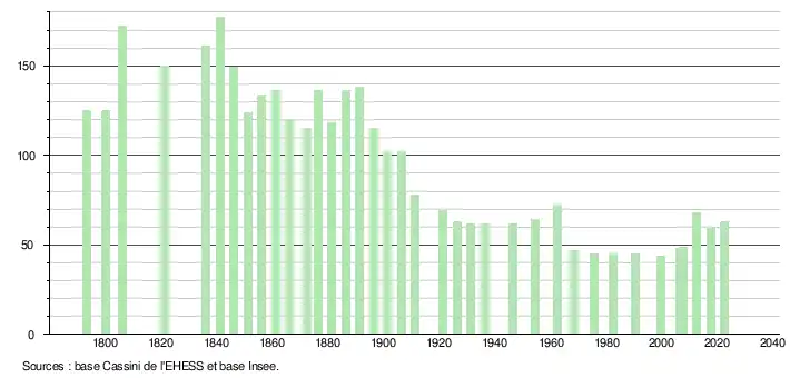 L'évolution du nombre d'habitants est connue à travers les recensements de la population effectués dans la commune depuis 1793. Pour les communes de moins de 10 000 habitants, une enquête de recensement portant sur toute la population est réalisée tous les cinq ans, les populations de référence des années intermédiaires étant quant à elles estimées par interpolation ou extrapolation[13]. Pour la commune, le premier recensement exhaustif entrant dans le cadre du nouveau dispositif a été réalisé en 2007[14].