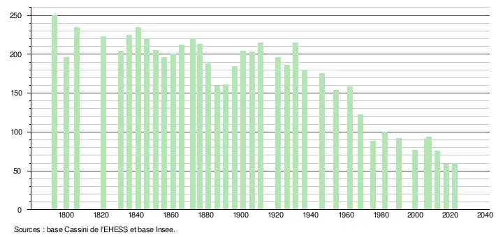 L'évolution du nombre d'habitants est connue à travers les recensements de la population effectués dans la commune depuis 1793. Pour les communes de moins de 10 000 habitants, une enquête de recensement portant sur toute la population est réalisée tous les cinq ans, les populations de référence des années intermédiaires étant quant à elles estimées par interpolation ou extrapolation[22]. Pour la commune, le premier recensement exhaustif entrant dans le cadre du nouveau dispositif a été réalisé en 2007[23].