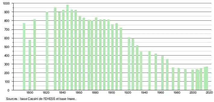 | L'évolution du nombre d'habitants est connue à travers les recensements de la population effectués dans la commune depuis 1793. Pour les communes de moins de 10 000 habitants, une enquête de recensement portant sur toute la population est réalisée tous les cinq ans, les populations de référence des années intermédiaires étant quant à elles estimées par interpolation ou extrapolation[9]. Pour la commune, le premier recensement exhaustif entrant dans le cadre du nouveau dispositif a été réalisé en 2004[10]. En 2016, la commune comptait 272 habitants[Note 1], en évolution de +5,43 % par rapport à 2010 (Tarn : +2,52 %, France hors Mayotte : +2,11 %). |