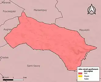 Le retrait-gonflement des sols argileux est susceptible d'engendrer des dommages importants aux bâtiments en cas d’alternance de périodes de sécheresse et de pluie. La totalité de la commune est en aléa moyen ou fort (94,5 % au niveau départemental et 48,5 % au niveau national). Sur les 90 bâtiments dénombrés sur la commune en 2019, 90 sont en aléa moyen ou fort, soit 100 %, à comparer aux 93 % au niveau départemental et 54 % au niveau national. Une cartographie de l'exposition du territoire national au retrait gonflement des sols argileux est disponible sur le site du BRGM[18],[Carte 3].