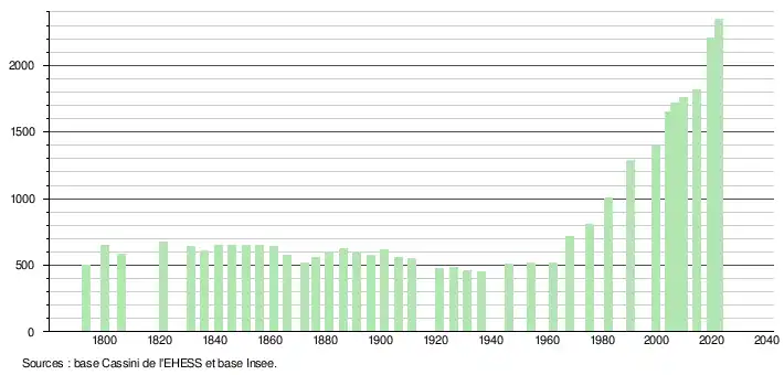 L'évolution du nombre d'habitants est connue à travers les recensements de la population effectués dans la commune depuis 1793. Pour les communes de moins de 10 000 habitants, une enquête de recensement portant sur toute la population est réalisée tous les cinq ans, les populations de référence des années intermédiaires étant quant à elles estimées par interpolation ou extrapolation[22]. Pour la commune, le premier recensement exhaustif entrant dans le cadre du nouveau dispositif a été réalisé en 2004[23].
