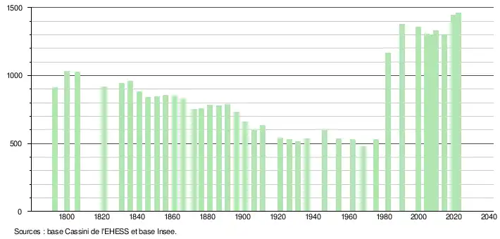 L'évolution du nombre d'habitants est connue à travers les recensements de la population effectués dans la commune depuis 1793. Pour les communes de moins de 10 000 habitants, une enquête de recensement portant sur toute la population est réalisée tous les cinq ans, les populations de référence des années intermédiaires étant quant à elles estimées par interpolation ou extrapolation[23]. Pour la commune, le premier recensement exhaustif entrant dans le cadre du nouveau dispositif a été réalisé en 2004[24].