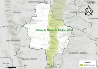 Une ZNIEFF de type 2[Note 1] est recensée sur la commune[12] : les « coteaux du Sousson de Samaran à Pavie » (2 695 ha), couvrant 14 communes du département[13].
