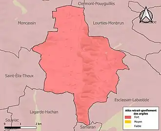 Le retrait-gonflement des sols argileux est susceptible d'engendrer des dommages importants aux bâtiments en cas d’alternance de périodes de sécheresse et de pluie. La totalité de la commune est en aléa moyen ou fort (94,5 % au niveau départemental et 48,5 % au niveau national). Sur les 69 bâtiments dénombrés sur la commune en 2019, 69 sont en aléa moyen ou fort, soit 100 %, à comparer aux 93 % au niveau départemental et 54 % au niveau national. Une cartographie de l'exposition du territoire national au retrait gonflement des sols argileux est disponible sur le site du BRGM[17],[Carte 3].