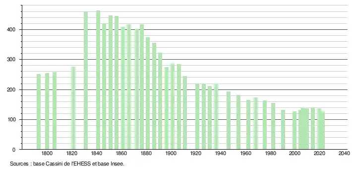 L'évolution du nombre d'habitants est connue à travers les recensements de la population effectués dans la commune depuis 1793. Pour les communes de moins de 10 000 habitants, une enquête de recensement portant sur toute la population est réalisée tous les cinq ans, les populations de référence des années intermédiaires étant quant à elles estimées par interpolation ou extrapolation[20]. Pour la commune, le premier recensement exhaustif entrant dans le cadre du nouveau dispositif a été réalisé en 2004[21].