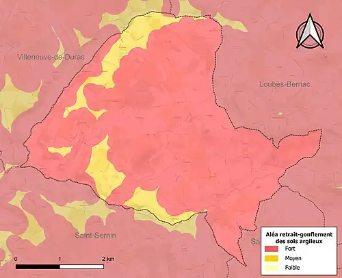 Le retrait-gonflement des sols argileux est susceptible d'engendrer des dommages importants aux bâtiments en cas d’alternance de périodes de sécheresse et de pluie[19]. La totalité de la commune est en aléa moyen ou fort (91,8 % au niveau départemental et 48,5 % au niveau national)[Carte 2]. Depuis le , en application de la loi ELAN, différentes contraintes s'imposent aux vendeurs, maîtres d'ouvrages ou constructeurs de biens situés dans une zone classée en aléa moyen ou fort[Note 1],[20].