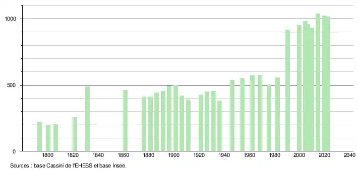 L'évolution du nombre d'habitants est connue à travers les recensements de la population effectués dans la commune depuis 1793. Pour les communes de moins de 10 000 habitants, une enquête de recensement portant sur toute la population est réalisée tous les cinq ans, les populations de référence des années intermédiaires étant quant à elles estimées par interpolation ou extrapolation[24]. Pour la commune, le premier recensement exhaustif entrant dans le cadre du nouveau dispositif a été réalisé en 2004[25].