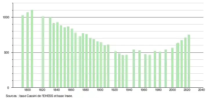 L'évolution du nombre d'habitants est connue à travers les recensements de la population effectués dans la commune depuis 1793. Pour les communes de moins de 10 000 habitants, une enquête de recensement portant sur toute la population est réalisée tous les cinq ans, les populations de référence des années intermédiaires étant quant à elles estimées par interpolation ou extrapolation[28]. Pour la commune, le premier recensement exhaustif entrant dans le cadre du nouveau dispositif a été réalisé en 2007[29].