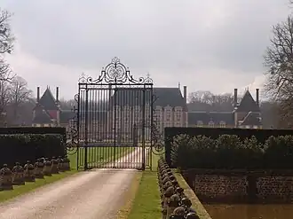 Classé MH (2004, 2005, partiellement)[32] datent de 1640 ; ils ont été aménagés pour l'une des grandes familles normandes, les Leroux[33]. Le château se compose d'un grand corps de logis, de brique et pierre, et d'ailes plus basses le prolongeant. Il conserve intérieurement des éléments de décor des XVIIe et XIXe siècles. Vendu en 1688 à la famille Pavyot, le domaine appartient toujours aux descendants de cette famille. Vers 1860 (famille Tirebarbe d'Aubermesnil), des transformations importantes ont été réalisées dans la cour d'honneur et de grandes écuries construites par l'architecte Hippolyte Destailleur et le parc transformé. Une partie des grilles provient de la fonderie d'art du Val d'Osne.
