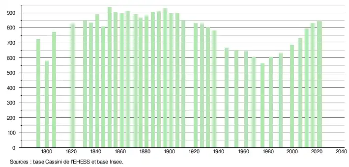 L'évolution du nombre d'habitants est connue à travers les recensements de la population effectués dans la commune depuis 1793. Pour les communes de moins de 10 000 habitants, une enquête de recensement portant sur toute la population est réalisée tous les cinq ans, les populations de référence des années intermédiaires étant quant à elles estimées par interpolation ou extrapolation[23]. Pour la commune, le premier recensement exhaustif entrant dans le cadre du nouveau dispositif a été réalisé en 2006[24].