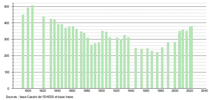 - ↑ Population municipale de référence en vigueur au 1er janvier 2025, millésimée 2022, définie dans les limites territoriales en vigueur au 1er janvier 2024, date de référence statistique : 1er janvier 2022.