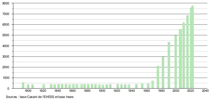 L'évolution du nombre d'habitants est connue à travers les recensements de la population effectués dans la commune depuis 1793. Pour les communes de moins de 10 000 habitants, une enquête de recensement portant sur toute la population est réalisée tous les cinq ans, les populations de référence des années intermédiaires étant quant à elles estimées par interpolation ou extrapolation[30]. Pour la commune, le premier recensement exhaustif entrant dans le cadre du nouveau dispositif a été réalisé en 2005[31].