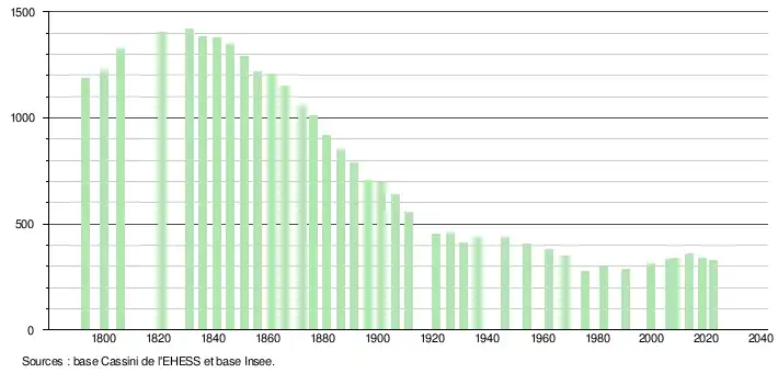 L'évolution du nombre d'habitants est connue à travers les recensements de la population effectués dans la commune depuis 1793. Pour les communes de moins de 10 000 habitants, une enquête de recensement portant sur toute la population est réalisée tous les cinq ans, les populations de référence des années intermédiaires étant quant à elles estimées par interpolation ou extrapolation[30]. Pour la commune, le premier recensement exhaustif entrant dans le cadre du nouveau dispositif a été réalisé en 2008[31].