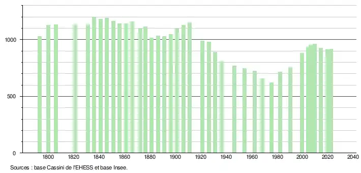 L'évolution du nombre d'habitants est connue à travers les recensements de la population effectués dans la commune depuis 1793. Pour les communes de moins de 10 000 habitants, une enquête de recensement portant sur toute la population est réalisée tous les cinq ans, les populations de référence des années intermédiaires étant quant à elles estimées par interpolation ou extrapolation[18]. Pour la commune, le premier recensement exhaustif entrant dans le cadre du nouveau dispositif a été réalisé en 2004[19].