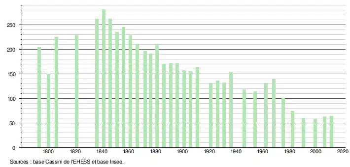 - ↑ Par convention dans Wikipédia, le principe a été retenu de n’afficher dans le tableau des recensements et le graphique, pour les populations légales postérieures à 1999, que les populations correspondant à une enquête exhaustive de recensement pour les communes de moins de 10 000 habitants, et que les populations des années 2006, 2011, 2016, etc. pour les communes de plus de 10 000 habitants, ainsi que la dernière population légale publiée par l’Insee pour l'ensemble des communes.