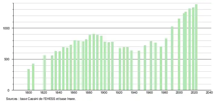 L'évolution du nombre d'habitants est connue à travers les recensements de la population effectués dans la commune depuis 1800. Pour les communes de moins de 10 000 habitants, une enquête de recensement portant sur toute la population est réalisée tous les cinq ans, les populations de référence des années intermédiaires étant quant à elles estimées par interpolation ou extrapolation[17]. Pour la commune, le premier recensement exhaustif entrant dans le cadre du nouveau dispositif a été réalisé en 2008[18].