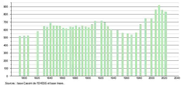 L'évolution du nombre d'habitants est connue à travers les recensements de la population effectués dans la commune depuis 1793. Pour les communes de moins de 10 000 habitants, une enquête de recensement portant sur toute la population est réalisée tous les cinq ans, les populations de référence des années intermédiaires étant quant à elles estimées par interpolation ou extrapolation[32]. Pour la commune, le premier recensement exhaustif entrant dans le cadre du nouveau dispositif a été réalisé en 2006[33].