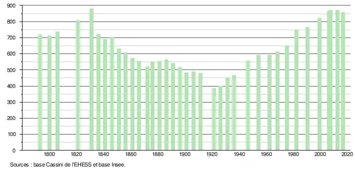 L'évolution du nombre d'habitants est connue à travers les recensements de la population effectués dans la commune depuis 1793. Pour les communes de moins de 10 000 habitants, une enquête de recensement portant sur toute la population est réalisée tous les cinq ans, les populations de référence des années intermédiaires étant quant à elles estimées par interpolation ou extrapolation[5]. Pour la commune, le premier recensement exhaustif entrant dans le cadre du nouveau dispositif a été réalisé en 2007[6].
