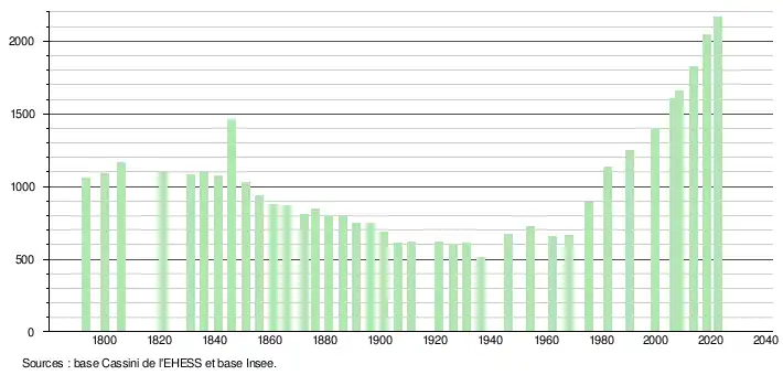 L'évolution du nombre d'habitants est connue à travers les recensements de la population effectués dans la commune depuis 1793. Pour les communes de moins de 10 000 habitants, une enquête de recensement portant sur toute la population est réalisée tous les cinq ans, les populations de référence des années intermédiaires étant quant à elles estimées par interpolation ou extrapolation[32]. Pour la commune, le premier recensement exhaustif entrant dans le cadre du nouveau dispositif a été réalisé en 2008[33].