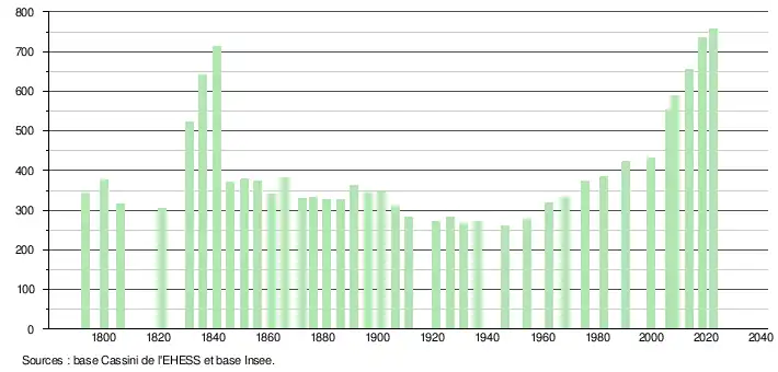 L'évolution du nombre d'habitants est connue à travers les recensements de la population effectués dans la commune depuis 1793. Pour les communes de moins de 10 000 habitants, une enquête de recensement portant sur toute la population est réalisée tous les cinq ans, les populations de référence des années intermédiaires étant quant à elles estimées par interpolation ou extrapolation[22]. Pour la commune, le premier recensement exhaustif entrant dans le cadre du nouveau dispositif a été réalisé en 2008[23].