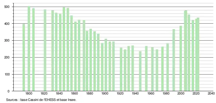 L'évolution du nombre d'habitants est connue à travers les recensements de la population effectués dans la commune depuis 1793. Pour les communes de moins de 10 000 habitants, une enquête de recensement portant sur toute la population est réalisée tous les cinq ans, les populations de référence des années intermédiaires étant quant à elles estimées par interpolation ou extrapolation[17]. Pour la commune, le premier recensement exhaustif entrant dans le cadre du nouveau dispositif a été réalisé en 2005[18].