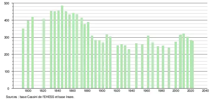 L'évolution du nombre d'habitants est connue à travers les recensements de la population effectués dans la commune depuis 1793. Pour les communes de moins de 10 000 habitants, une enquête de recensement portant sur toute la population est réalisée tous les cinq ans, les populations de référence des années intermédiaires étant quant à elles estimées par interpolation ou extrapolation[25]. Pour la commune, le premier recensement exhaustif entrant dans le cadre du nouveau dispositif a été réalisé en 2005[26].