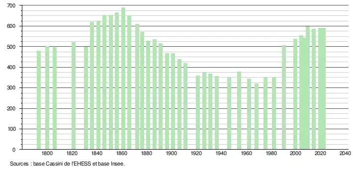 L'évolution du nombre d'habitants est connue à travers les recensements de la population effectués dans la commune depuis 1793. Pour les communes de moins de 10 000 habitants, une enquête de recensement portant sur toute la population est réalisée tous les cinq ans, les populations de référence des années intermédiaires étant quant à elles estimées par interpolation ou extrapolation[39]. Pour la commune, le premier recensement exhaustif entrant dans le cadre du nouveau dispositif a été réalisé en 2004[40].
