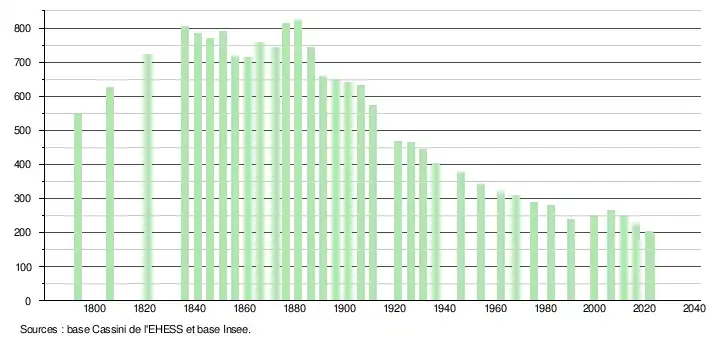 L'évolution du nombre d'habitants est connue à travers les recensements de la population effectués dans la commune depuis 1793. Pour les communes de moins de 10 000 habitants, une enquête de recensement portant sur toute la population est réalisée tous les cinq ans, les populations de référence des années intermédiaires étant quant à elles estimées par interpolation ou extrapolation[15]. Pour la commune, le premier recensement exhaustif entrant dans le cadre du nouveau dispositif a été réalisé en 2006[16].