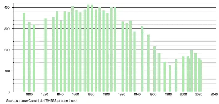 L'évolution du nombre d'habitants est connue à travers les recensements de la population effectués dans la commune depuis 1793. Pour les communes de moins de 10 000 habitants, une enquête de recensement portant sur toute la population est réalisée tous les cinq ans, les populations de référence des années intermédiaires étant quant à elles estimées par interpolation ou extrapolation[32]. Pour la commune, le premier recensement exhaustif entrant dans le cadre du nouveau dispositif a été réalisé en 2005[33].