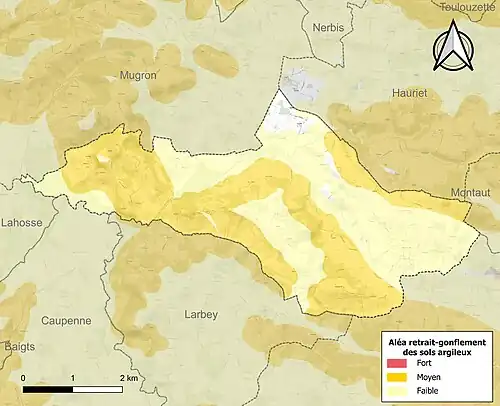 Le retrait-gonflement des sols argileux est susceptible d'engendrer des dommages importants aux bâtiments en cas d’alternance de périodes de sécheresse et de pluie. 51,3 % de la superficie communale est en aléa moyen ou fort (19,2 % au niveau départemental et 48,5 % au niveau national). Sur les 234 bâtiments dénombrés sur la commune en 2019, 76 sont en aléa moyen ou fort, soit 32 %, à comparer aux 17 % au niveau départemental et 54 % au niveau national. Une cartographie de l'exposition du territoire national au retrait gonflement des sols argileux est disponible sur le site du BRGM[19],[Carte 2].