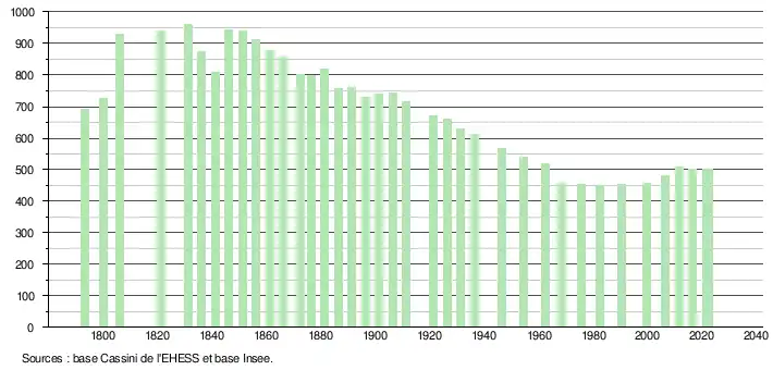 | L'évolution du nombre d'habitants est connue à travers les recensements de la population effectués dans la commune depuis 1793. Pour les communes de moins de 10 000 habitants, une enquête de recensement portant sur toute la population est réalisée tous les cinq ans, les populations de référence des années intermédiaires étant quant à elles estimées par interpolation ou extrapolation[20]. Pour la commune, le premier recensement exhaustif entrant dans le cadre du nouveau dispositif a été réalisé en 2006[21]. En 2022, la commune comptait 500 habitants[Note 1], en évolution de −0,2 % par rapport à 2016 (Landes : +5,78 %, France hors Mayotte : +2,11 %). |