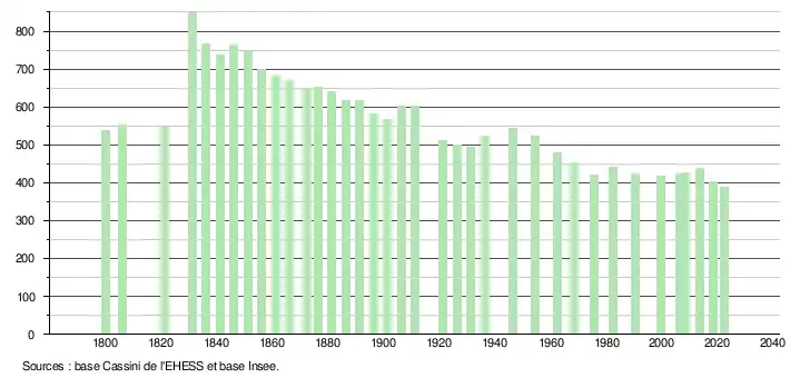 | L'évolution du nombre d'habitants est connue à travers les recensements de la population effectués dans la commune depuis 1800. Pour les communes de moins de 10 000 habitants, une enquête de recensement portant sur toute la population est réalisée tous les cinq ans, les populations de référence des années intermédiaires étant quant à elles estimées par interpolation ou extrapolation[20]. Pour la commune, le premier recensement exhaustif entrant dans le cadre du nouveau dispositif a été réalisé en 2008[21]. En 2022, la commune comptait 389 habitants[Note 3], en évolution de −9,11 % par rapport à 2016 (Lot-et-Garonne : −0,18 %, France hors Mayotte : +2,11 %). |