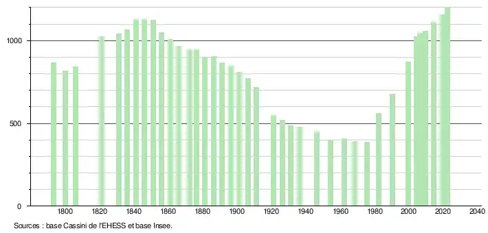 L'évolution du nombre d'habitants est connue à travers les recensements de la population effectués dans la commune depuis 1793. Pour les communes de moins de 10 000 habitants, une enquête de recensement portant sur toute la population est réalisée tous les cinq ans, les populations de référence des années intermédiaires étant quant à elles estimées par interpolation ou extrapolation[19]. Pour la commune, le premier recensement exhaustif entrant dans le cadre du nouveau dispositif a été réalisé en 2004[20].