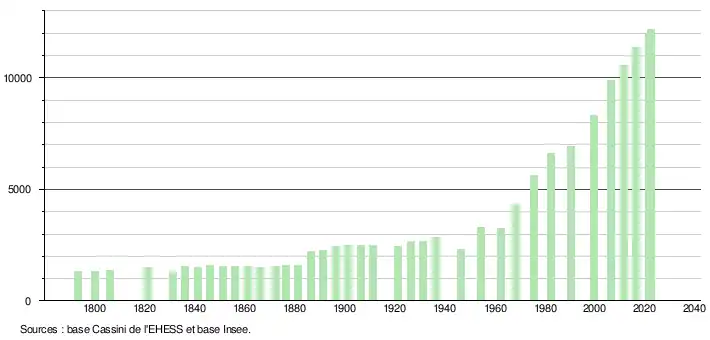 - ↑ Par convention dans Wikipédia, le principe a été retenu de n’afficher dans le tableau des recensements et le graphique, pour les populations de référence postérieures à 1999, que les populations correspondant à une enquête exhaustive de recensement pour les communes de moins de 10 000 habitants, et que les populations des années 2006, 2011, 2016, etc. pour les communes de plus de 10 000 habitants, ainsi que la dernière population de référence publiée par l’Insee pour l'ensemble des communes.