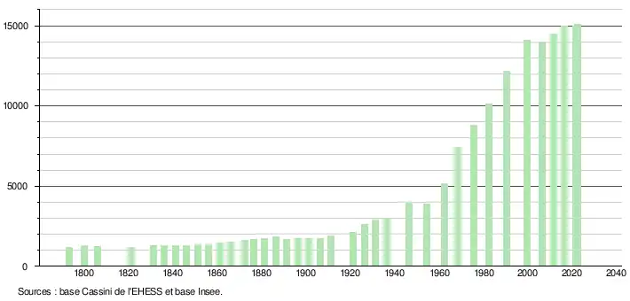 - ↑ Par convention dans Wikipédia, le principe a été retenu de n’afficher dans le tableau des recensements et le graphique, pour les populations de référence postérieures à 1999, que les populations correspondant à une enquête exhaustive de recensement pour les communes de moins de 10 000 habitants, et que les populations des années 2006, 2011, 2016, etc. pour les communes de plus de 10 000 habitants, ainsi que la dernière population de référence publiée par l’Insee pour l'ensemble des communes.