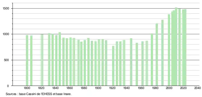 L'évolution du nombre d'habitants est connue à travers les recensements de la population effectués dans la commune depuis 1800. Pour les communes de moins de 10 000 habitants, une enquête de recensement portant sur toute la population est réalisée tous les cinq ans, les populations de référence des années intermédiaires étant quant à elles estimées par interpolation ou extrapolation[32]. Pour la commune, le premier recensement exhaustif entrant dans le cadre du nouveau dispositif a été réalisé en 2004[33].