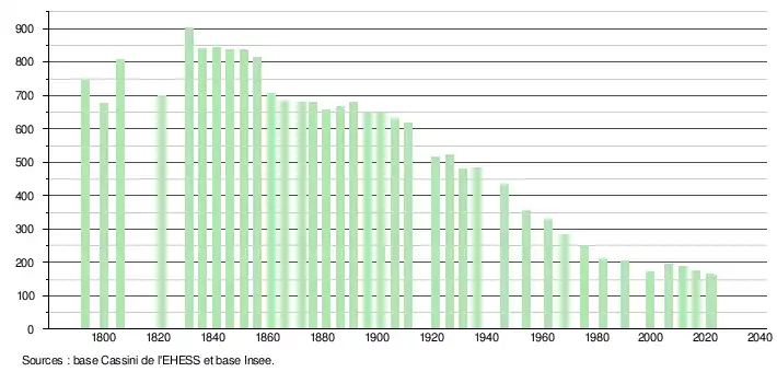 L'évolution du nombre d'habitants est connue à travers les recensements de la population effectués dans la commune depuis 1793. Pour les communes de moins de 10 000 habitants, une enquête de recensement portant sur toute la population est réalisée tous les cinq ans, les populations de référence des années intermédiaires étant quant à elles estimées par interpolation ou extrapolation[18]. Pour la commune, le premier recensement exhaustif entrant dans le cadre du nouveau dispositif a été réalisé en 2006[19].
