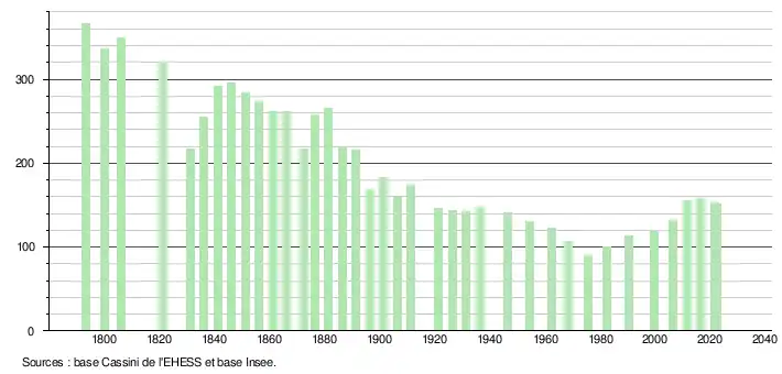 - ↑ Fiches Insee - Populations de référence de la commune pour les années 2006, 2007, 2008, 2009, 2010, 2011, 2012, 2013, 2014, 2015, 2016, 2017, 2018, 2019, 2020, 2021 et 2022.