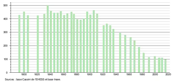 L'évolution du nombre d'habitants est connue à travers les recensements de la population effectués dans la commune depuis 1793. Pour les communes de moins de 10 000 habitants, une enquête de recensement portant sur toute la population est réalisée tous les cinq ans, les populations de référence des années intermédiaires étant quant à elles estimées par interpolation ou extrapolation[4]. Pour la commune, le premier recensement exhaustif entrant dans le cadre du nouveau dispositif a été réalisé en 2005[5].