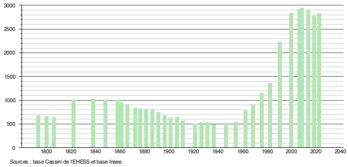 L'évolution du nombre d'habitants est connue à travers les recensements de la population effectués dans la commune depuis 1793. Pour les communes de moins de 10 000 habitants, une enquête de recensement portant sur toute la population est réalisée tous les cinq ans, les populations de référence des années intermédiaires étant quant à elles estimées par interpolation ou extrapolation[19]. Pour la commune, le premier recensement exhaustif entrant dans le cadre du nouveau dispositif a été réalisé en 2008[20].
